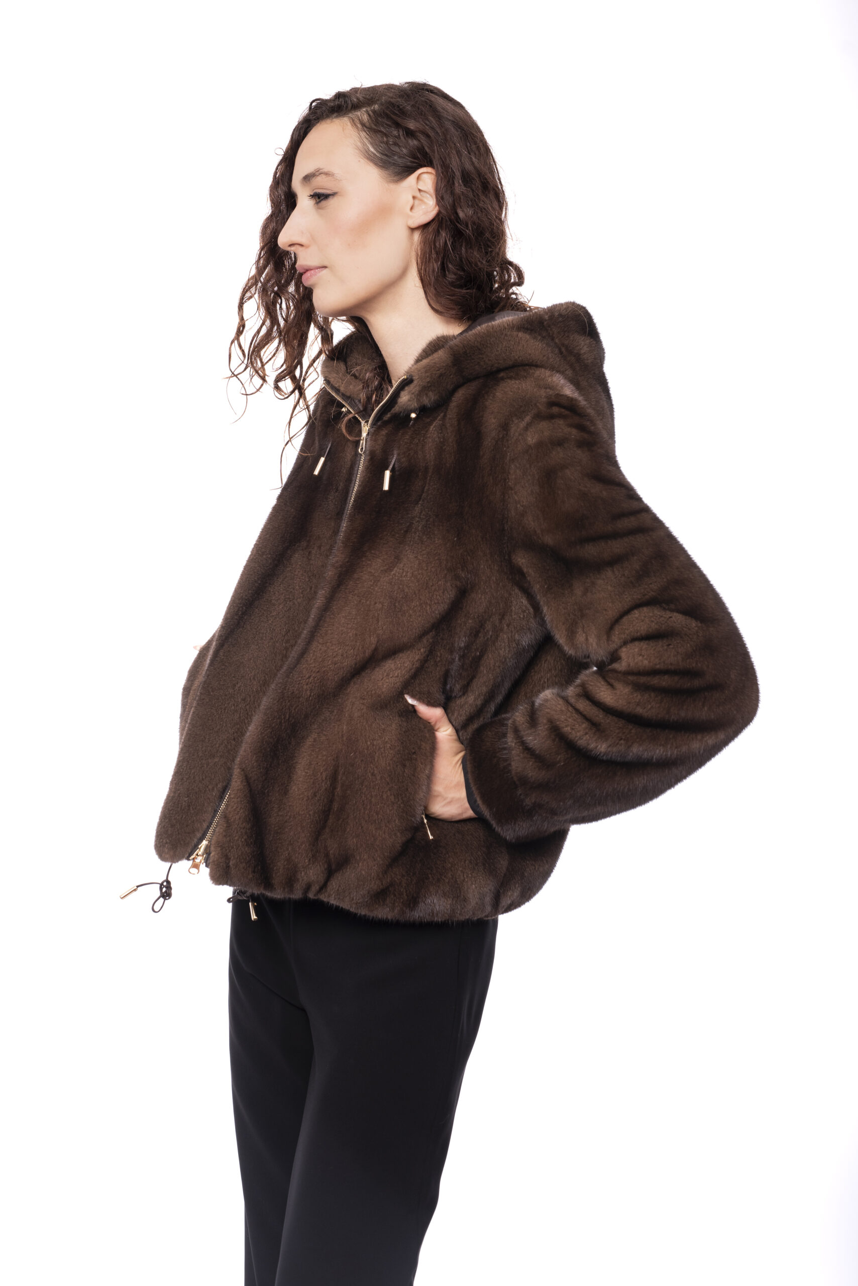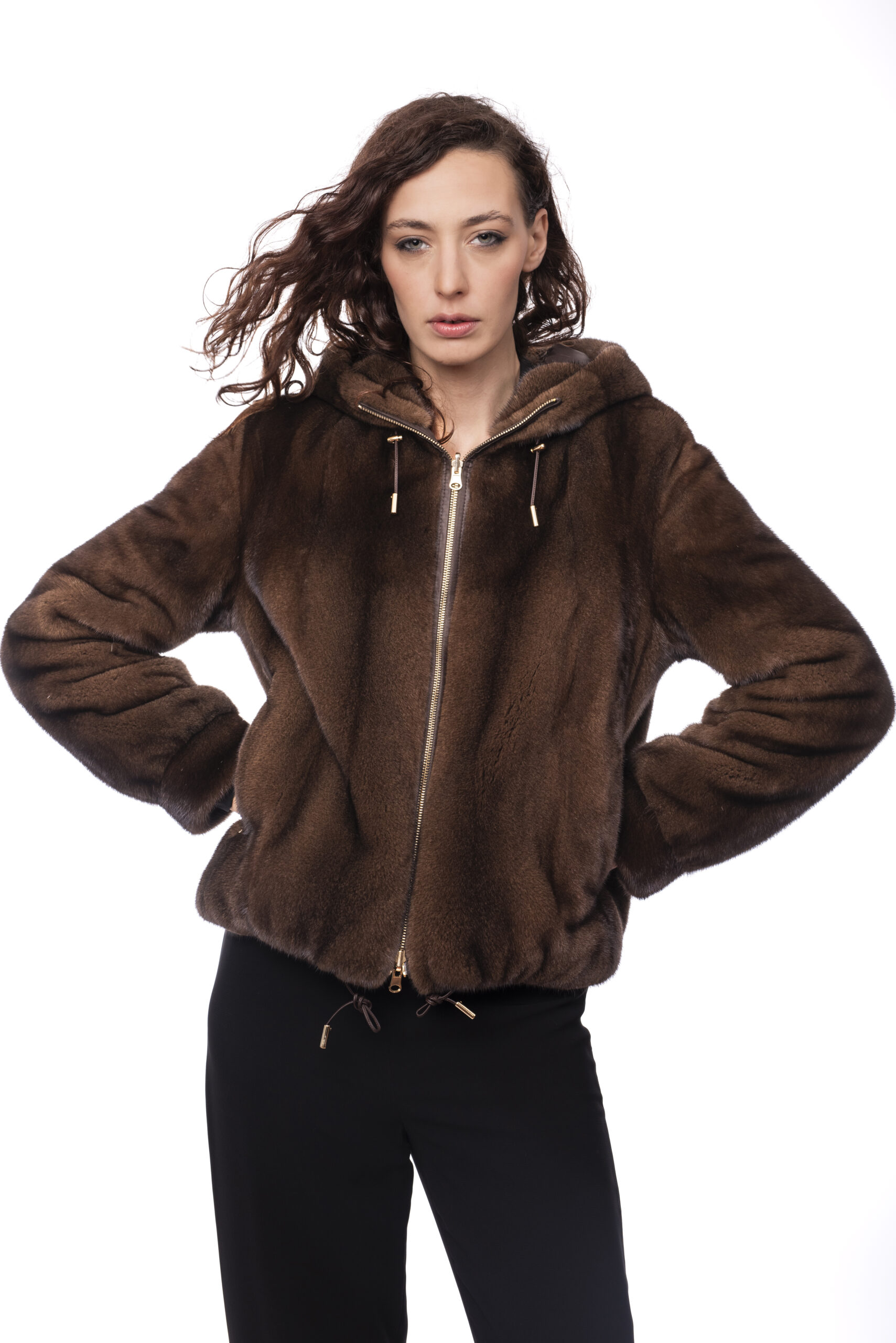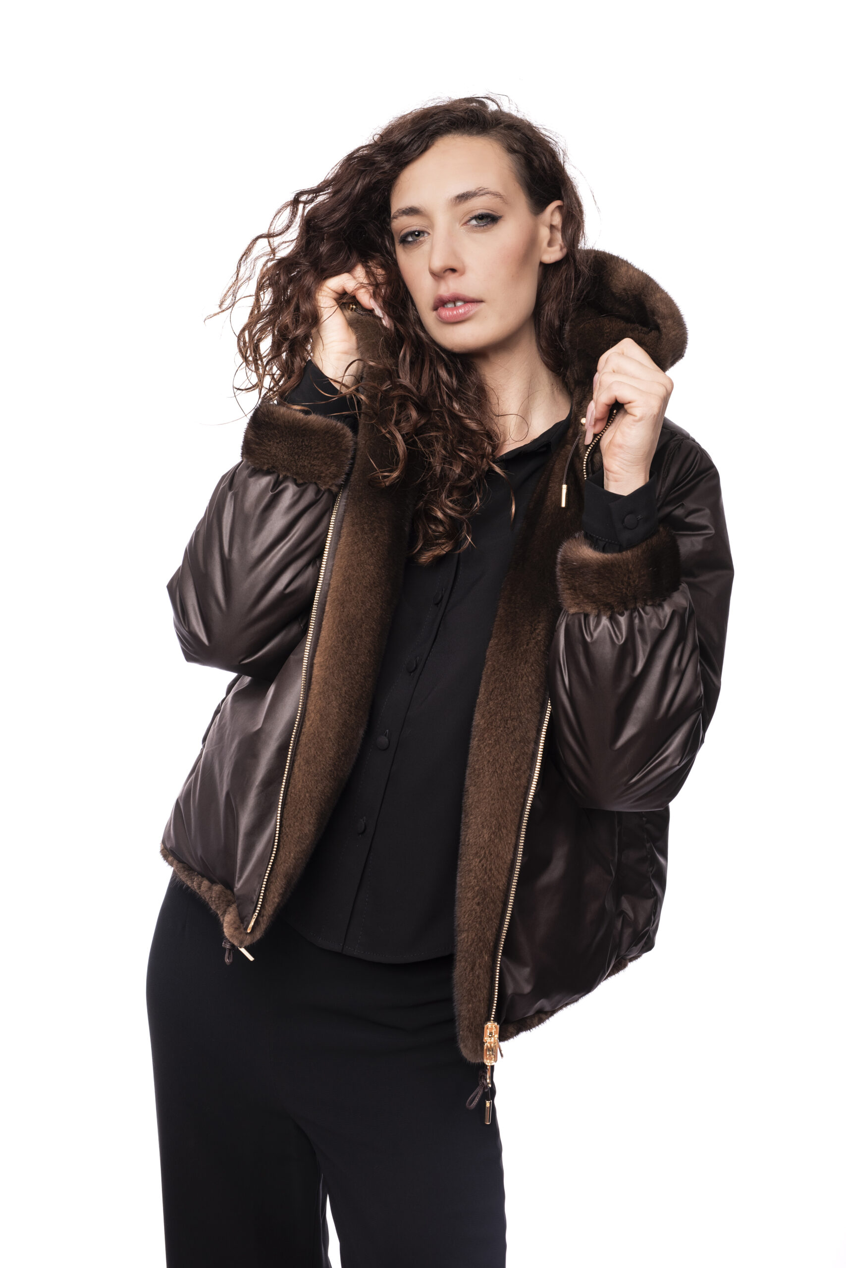 Con cappuccio e zip reversibile.